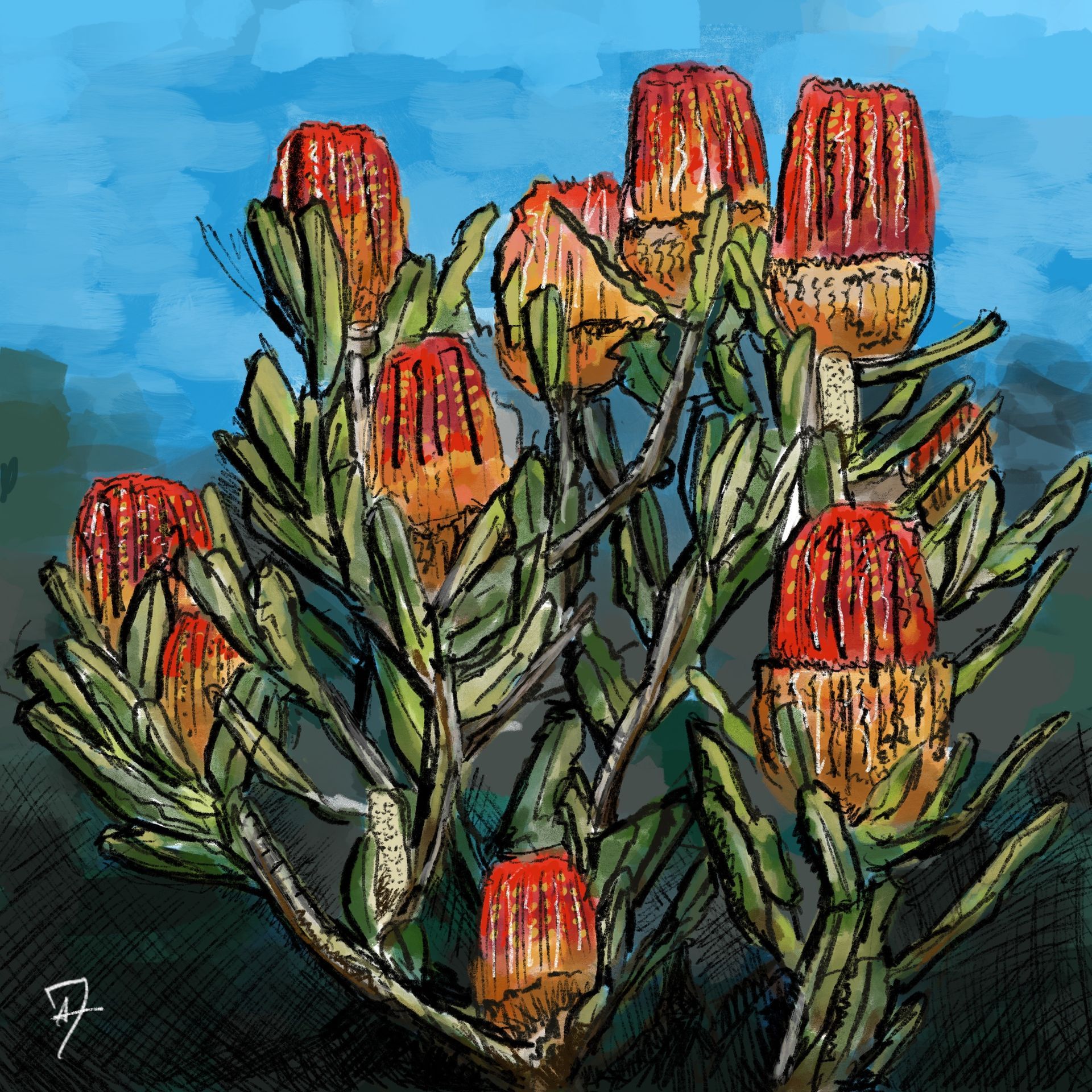 Introducing the Banksia Series by Andrew Derkatch, a stunning collection capturing the unique flora of Sydney. Produced using a mix of digital paint, acrylic, gouache, oil, and pencil, these digital artworks bring to life the beauty of local plants in a truly innovative and captivating way.