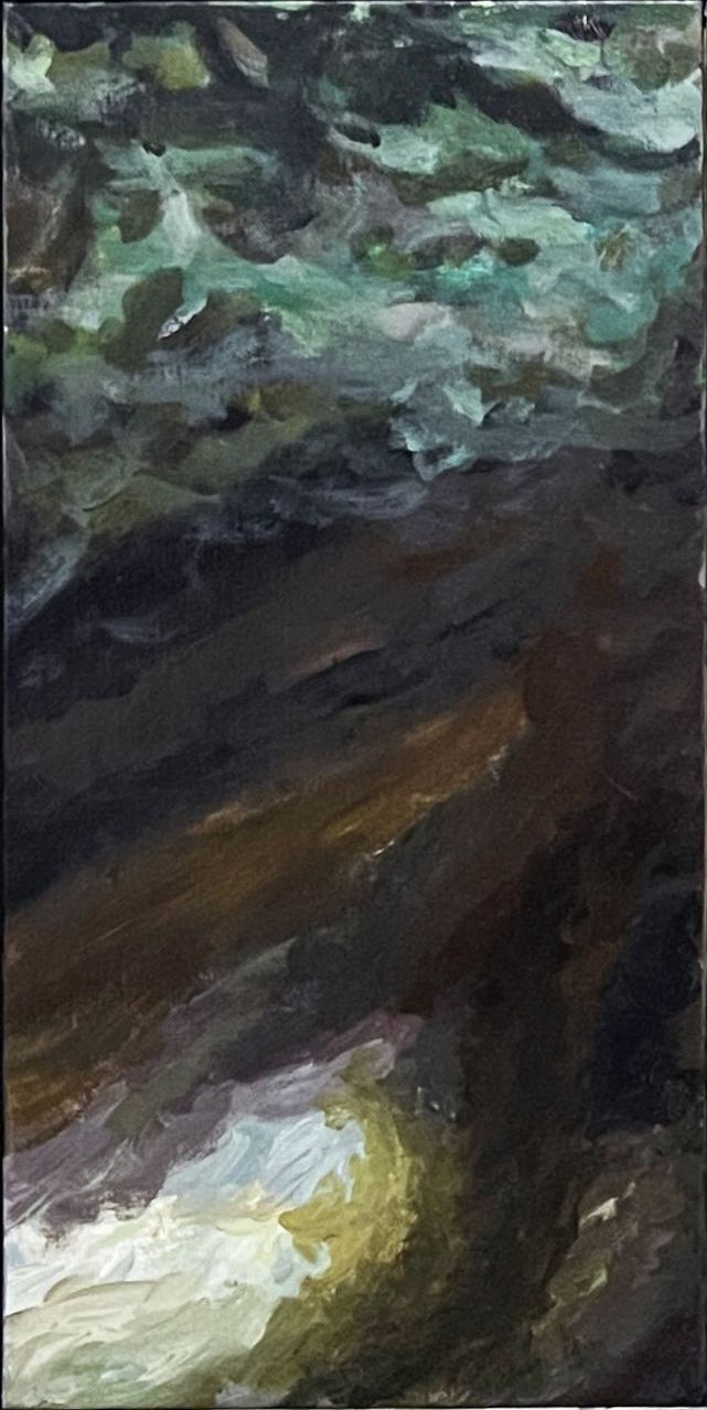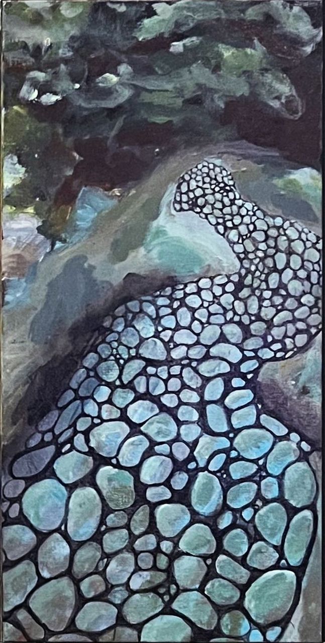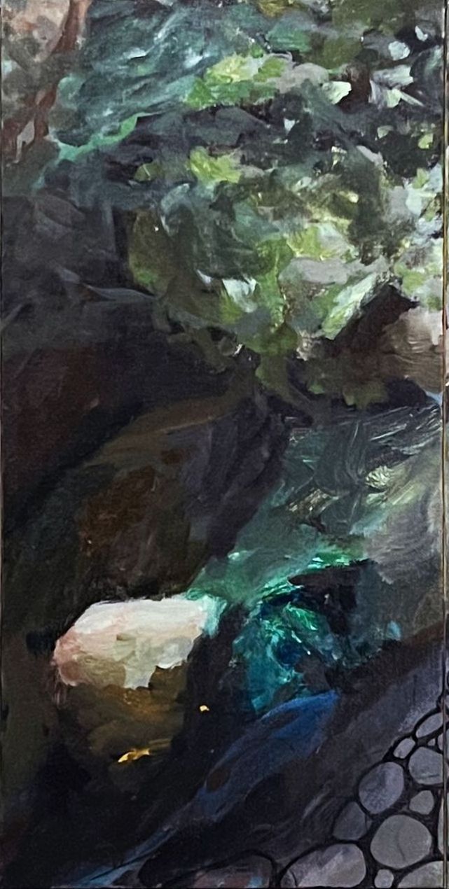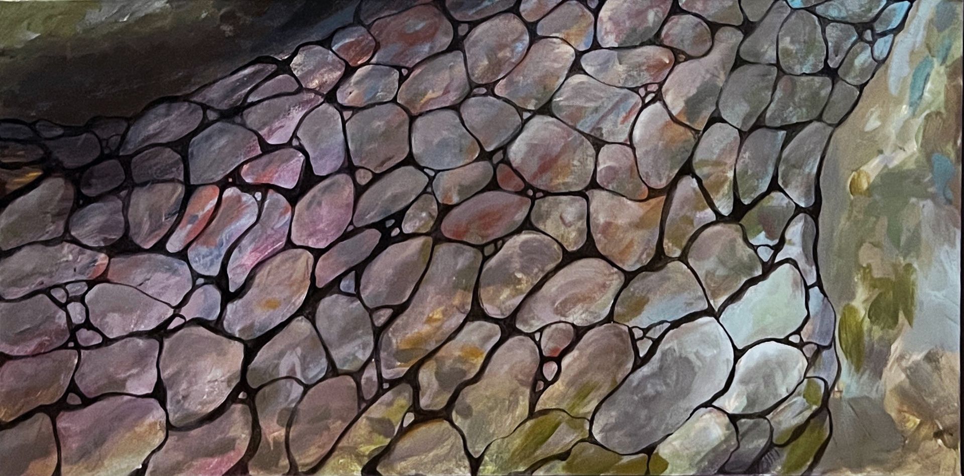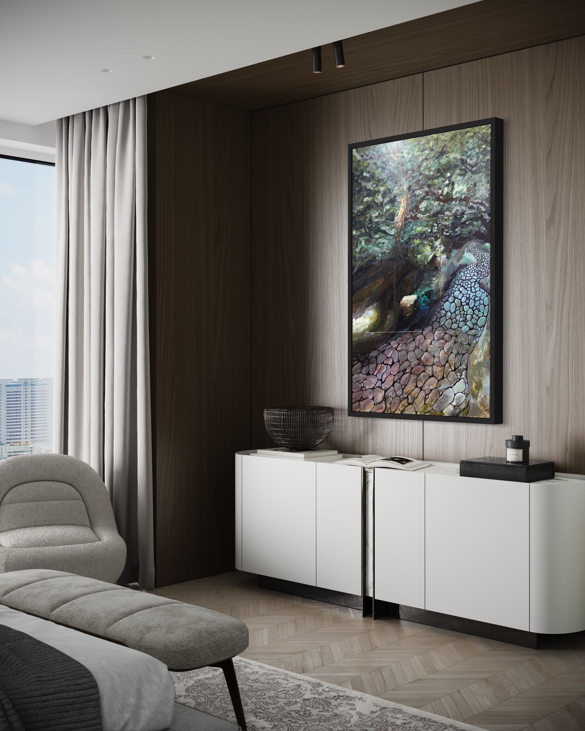 Karesansui elegantly traverses the boundary between traditional Eastern and Western art forms. Split across several panels, invokes the essence of a Karesansui, or Japanese rock garden, with its textured surface work and deliberate stone placements.